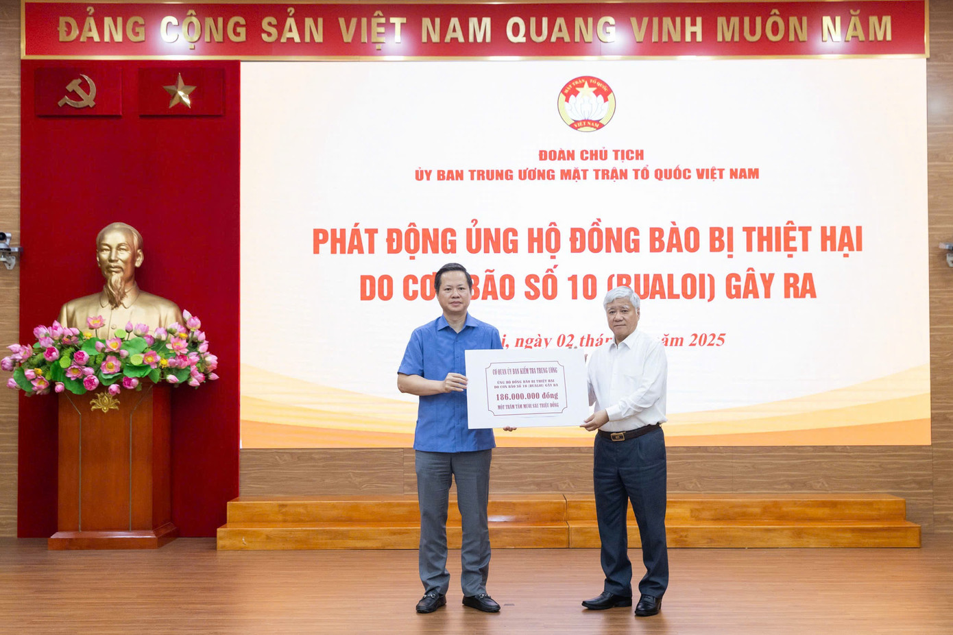 Ủy viên Bộ Chính trị, Bí thư Trung ương Đảng, Chủ tịch Ủy ban Trung ương MTTQ Việt Nam Đỗ Văn Chiến và các đại biểu ủng hộ đồng bào bị ảnh hưởng bởi bão số 10. Ảnh: PV.