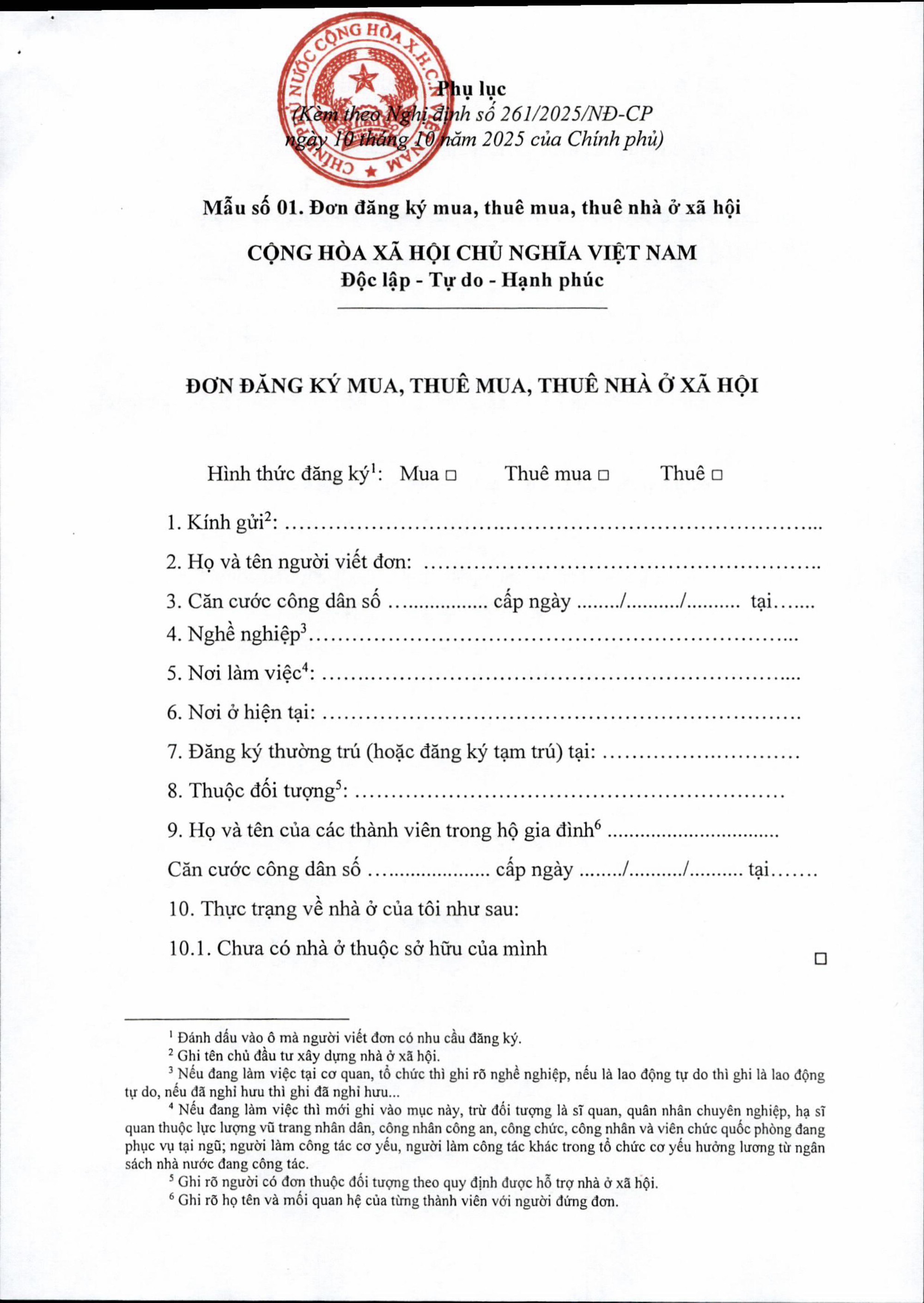 Kèm theo Nghị định số 261/2025/NĐ-CP phụ lục: Mẫu số 01. Đơn đăng ký mua, thuê mua, thuê nhà ở xã hội. Cụ thể: