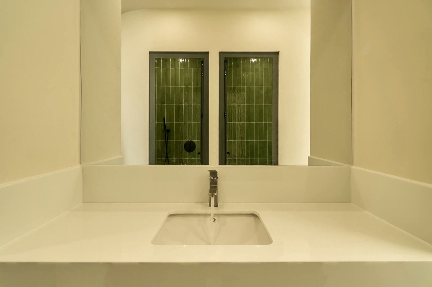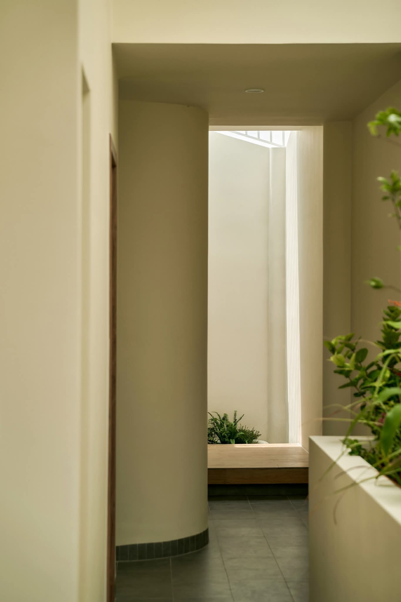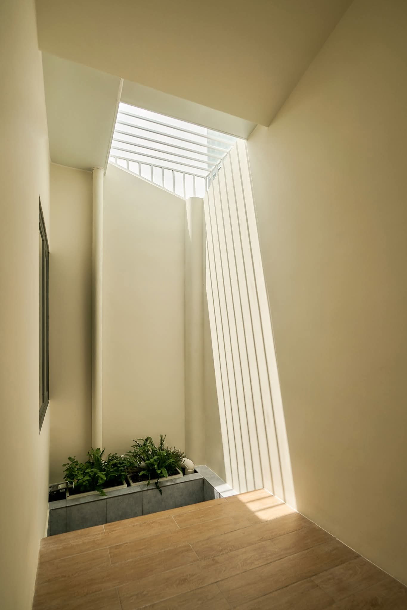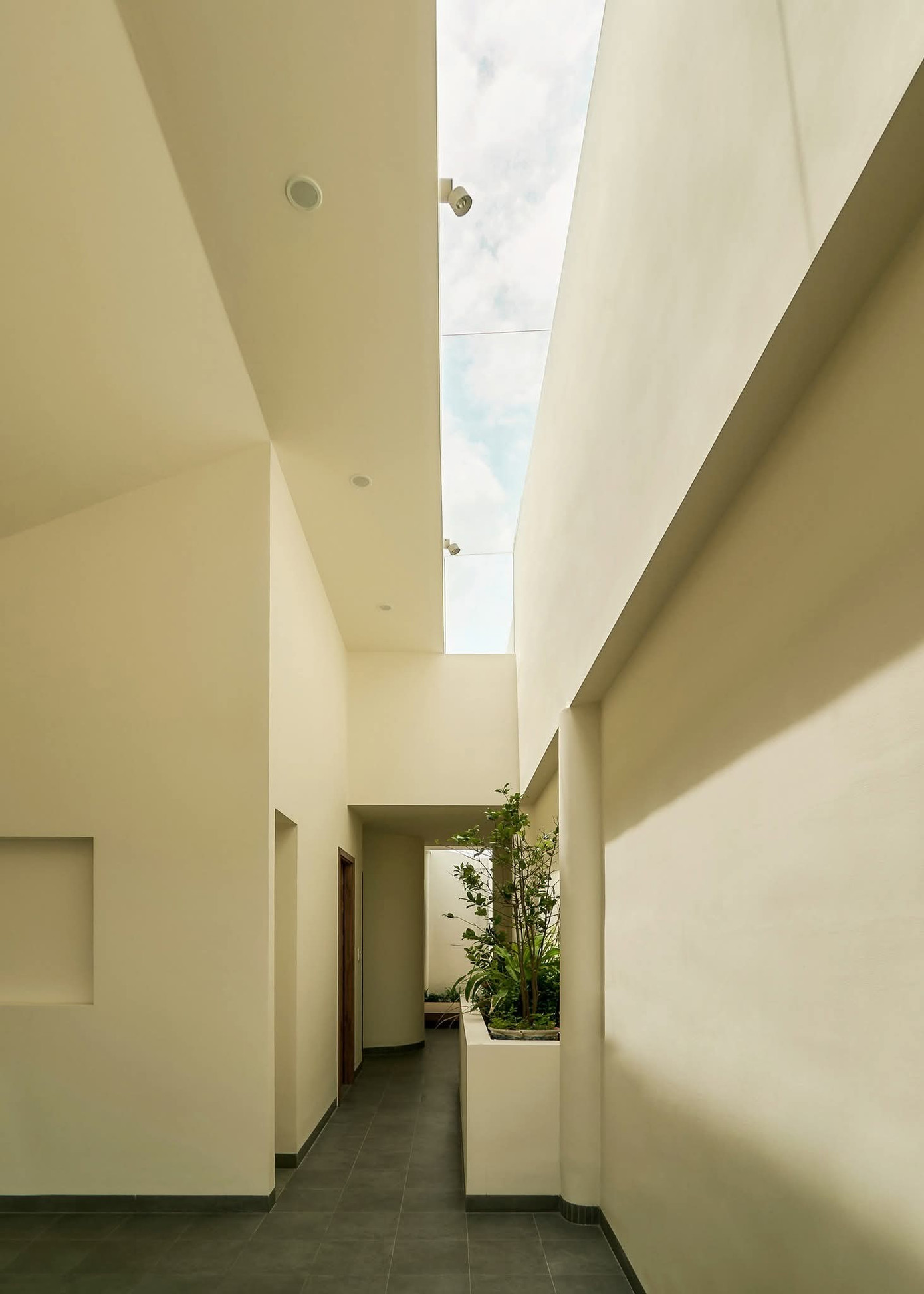 Trong quá trình thiết kế, KTS đặt trọng tâm vào giải pháp vi khí hậu cao. Hệ thống ba giếng trời kết hợp với hồ nước cuối nhà giúp thông gió tự nhiên, giúp các không gian luôn được làm mát và thoáng. Nguồn sáng từ giếng trời trung tâm được kiểm soát tinh tế từ lối thiết kế thụ động trong kiến trúc, cho phép ánh nắng đi vào nhà mỗi 1,5 giờ trong ngày - vừa đủ để cây xanh quang hợp, đồng thời kháng khuẩn, điều hòa độ ẩm và khử mùi.