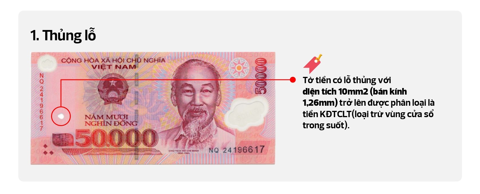 - Tờ tiền KĐTCLT có phần cửa sổ nhỏ không còn trong suốt/Lớp mực in phủ nền xung quanh cửa sổ bị mòn hoặc mất, ảnh hưởng hình dạng cửa sổ.