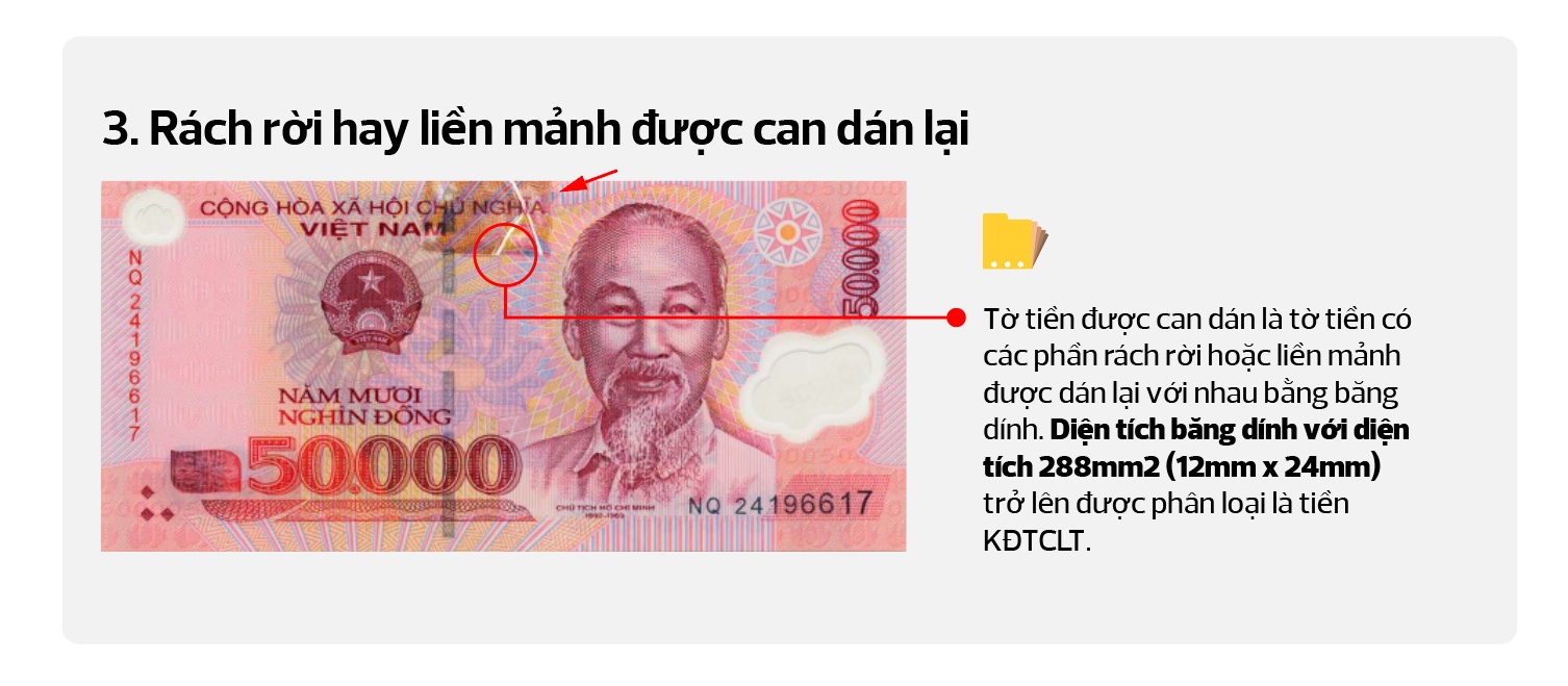- Tờ tiền KĐTCLT có phần cụm số dập nổi suy giảm lớn về hình ảnh/Hư hỏng về cấu trúc, định dạng, khó kiểm tra, nhận biết tính chất, đặc điểm.