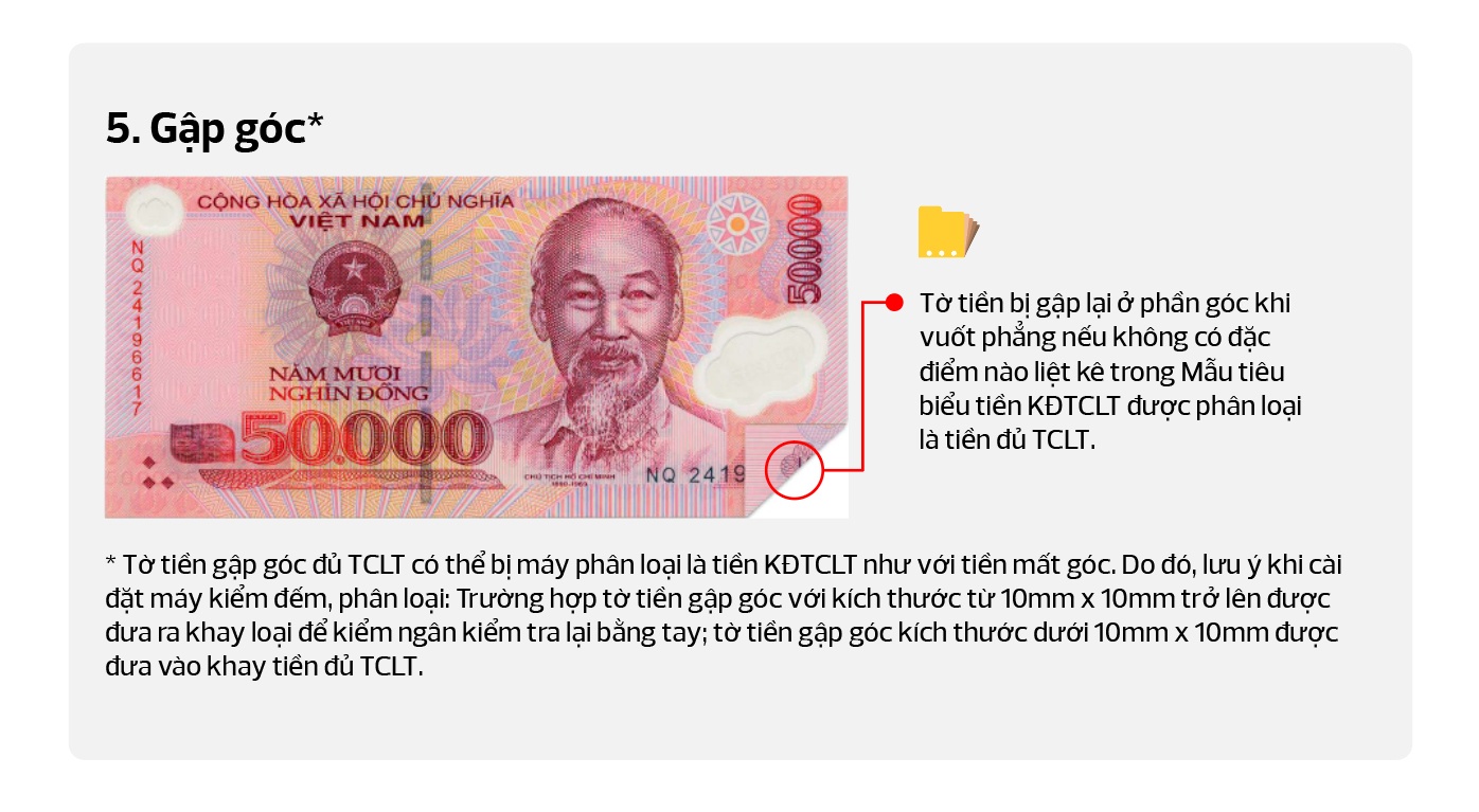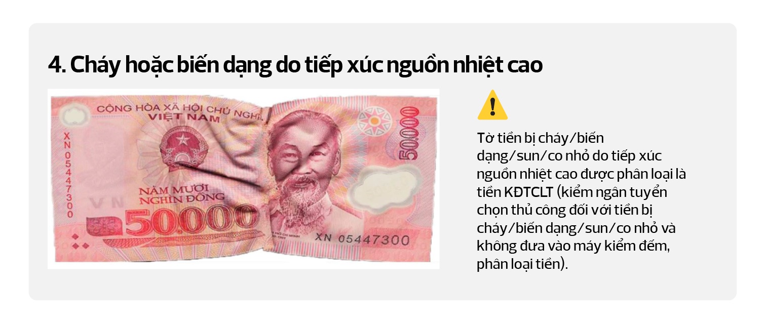 Tờ tiền KĐTCLT có mực in nền phát quang kém (mờ), khó kiểm tra, nhận biết tính chất, đặc điểm/Có sự suy giảm lớn về hình ảnh/Hư hỏng về cấu trúc, định dạng hoặc khả năng nhận biết tính chất, đặc điểm...