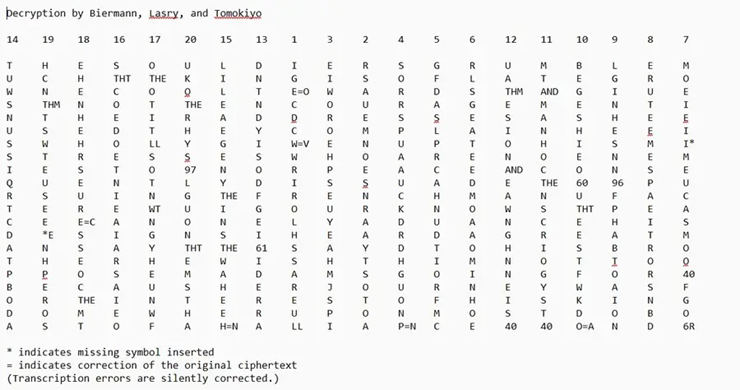 Bằng cách sử dụng phần mềm bẻ khóa do chính họ phát triển kết hợp với phân tích thủ công chuyên sâu, các đội đã thành công tái hiện lại nội dung bức thư, ngay cả khi người viết đã vô tình bỏ sót một vài chữ cái.