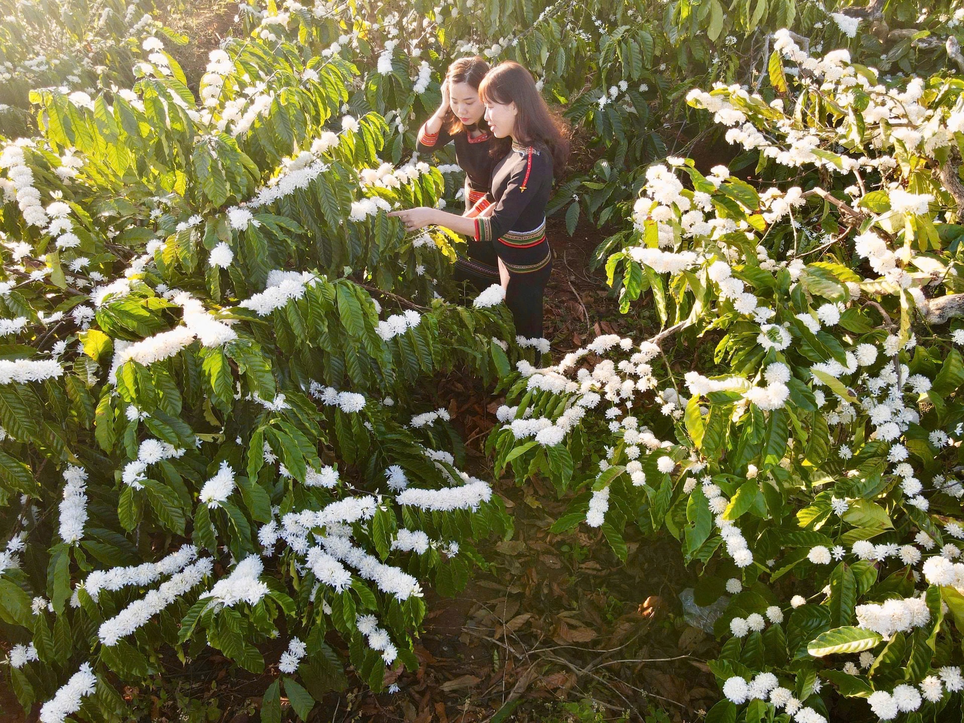 “Hoa nở đều, đậu nhụy tốt là coi như nắm chắc phần thắng trong tay” - ông Lê Văn Vương – Giám đốc Công ty TNHH Sản xuất và Thương mại Vương Thành Công (phường Ea Kao, tỉnh Đắk Lắk) phấn khởi chia sẻ khi nhìn những cành cà phê trắng muốt tại vùng nguyên liệu của công ty.