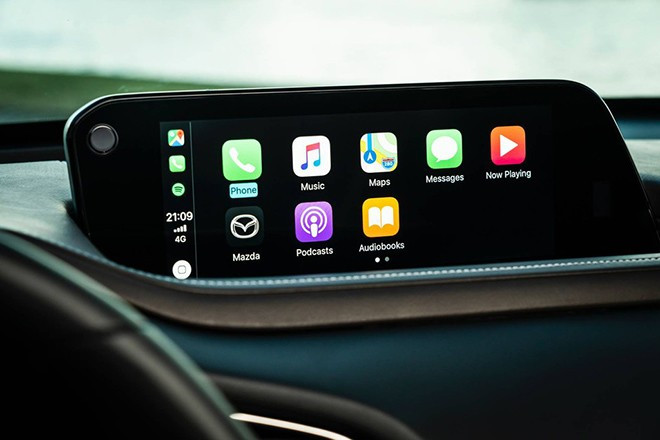 Khoang cabin của Mazda CX-30 được đánh giá cao nhờ sự kết hợp giữa vật liệu da và các chi tiết kim loại, mang lại cảm giác sang trọng. Trung tâm bảng táp-lô là màn hình giải trí 8,8 inch hỗ trợ kết nối Apple CarPlay và Android Auto. Vô-lăng 3 chấu bọc da tích hợp nhiều phím bấm chức năng, đi kèm màn hình HUD hiển thị tốc độ trên kính lái.