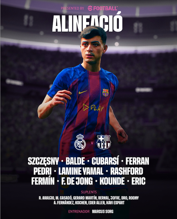 Szczesny; Kounde, E Garcia, Cubarsi, Balde; de Jong, Pedri; Yamal, Fermin, Rashford; Ferran