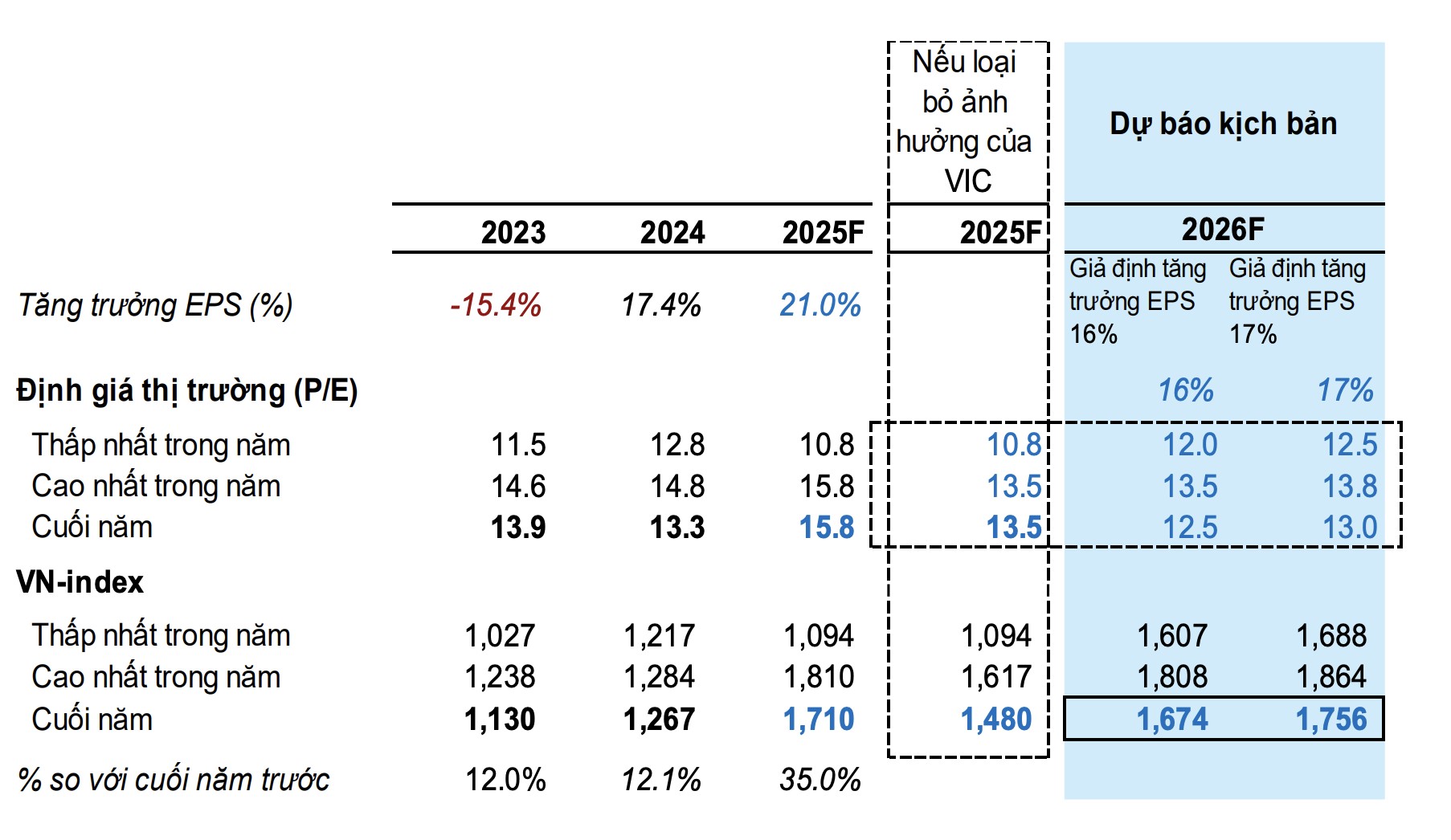 MBS sử dụng vùng định giá 12,5 lần - 13 lần P/E cho năm 2026. Trên cơ sở kỳ vọng tăng trưởng lợi nhuận của các doanh nghiệp niêm yết ở mức 16% - 17%, đơn vị phân tích dự báo VN-Index sẽ đạt ở mức 1.670 - 1.750 vào cuối năm 2026.