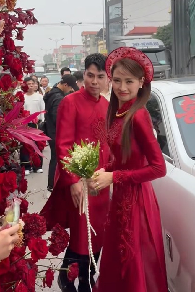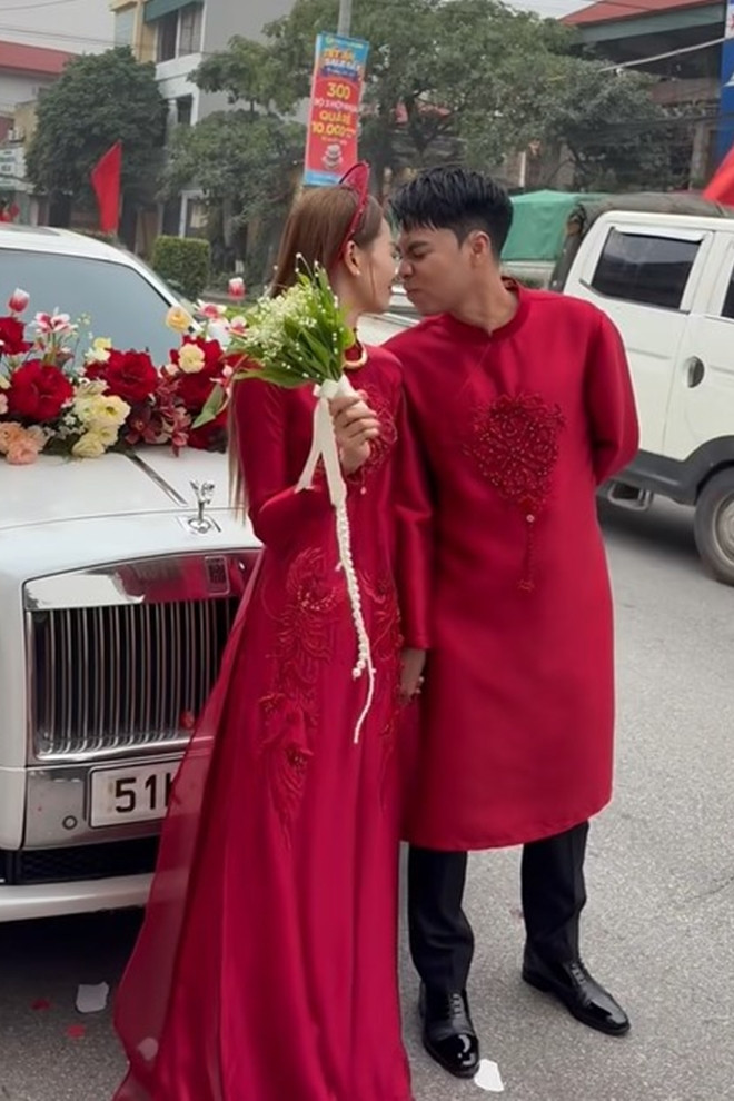 Cặp đôi diện áo dài đỏ đồng điệu. Bên dàn xe sang rước dâu, hai người trao nhau khoảnh khắc âu yếm ngọt ngào, nụ hôn nhẹ trước ống kính của người hâm mộ.