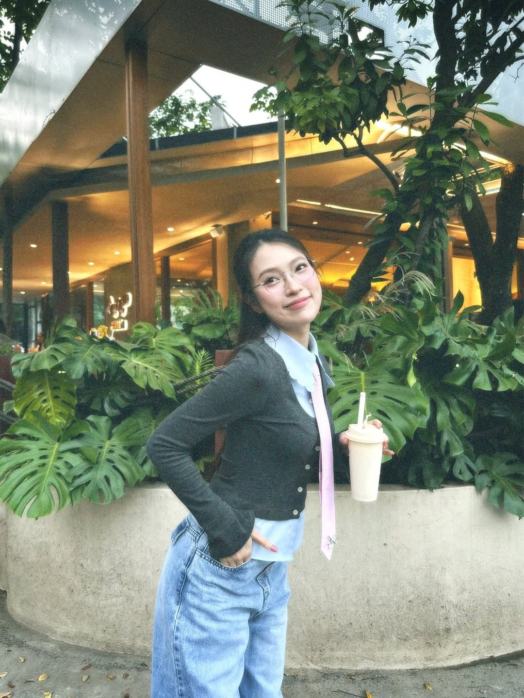 Trong loạt ảnh, Khánh Vy diện outfit đơn giản nhưng cực kỳ dễ thương với áo sơ mi xanh nhạt phối viền cổ bầu cách điệu. Cà vạt hồng pastel tạo điểm nhấn trẻ trung, tinh nghịch. Bên cạnh đó, quần jeans ống rộng mang hơi hướng retro, vừa thoải mái vừa hợp bối cảnh café ngoài trời.