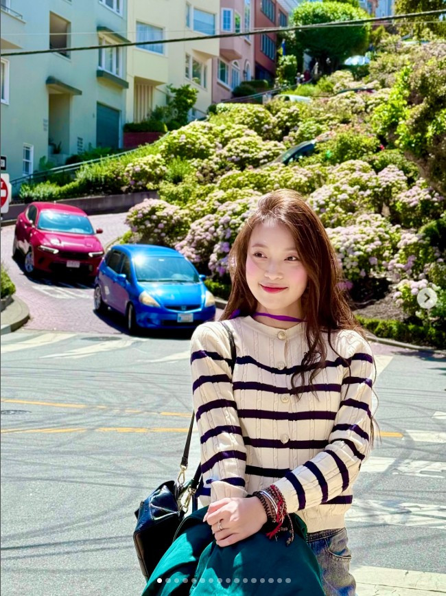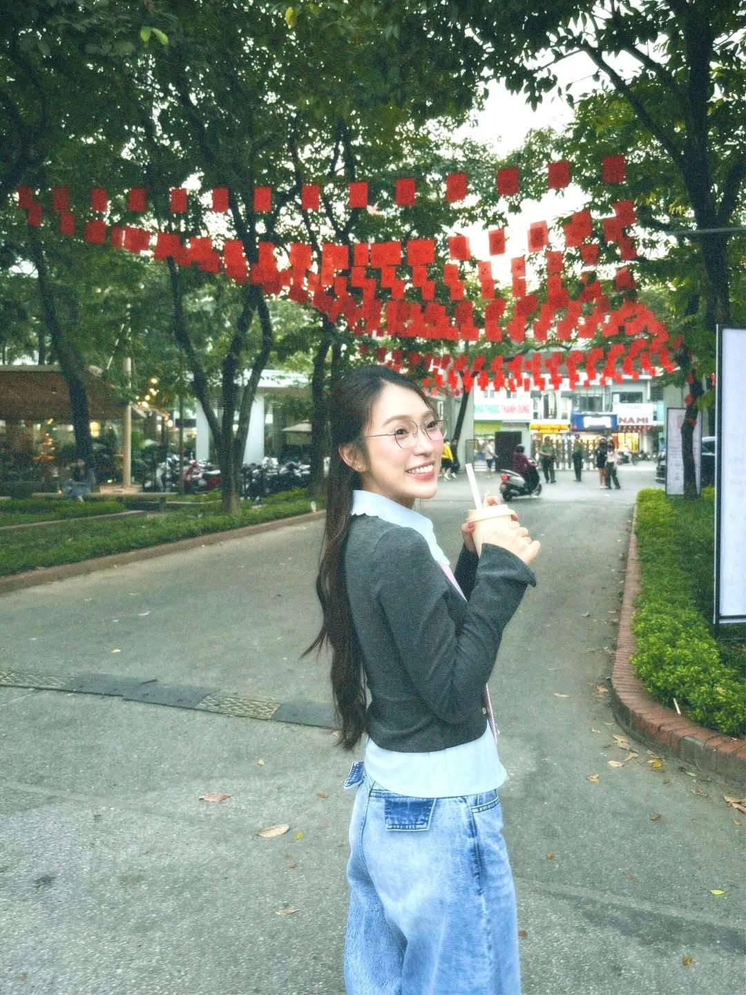 Vóc dáng của Khánh Vy nhỏ nhắn, thanh thoát. Cô đều thể hiện sự tự nhiên, thoải mái: khi ngồi trên ghế đá nâng ly đồ uống, khi mỉm cười nhìn thẳng camera, hay lúc quay lưng bước đi dưới những hàng đèn trang trí đỏ rực. Tất cả tạo nên vẻ đẹp trong trẻo, đời thường nhưng rất cuốn hút.