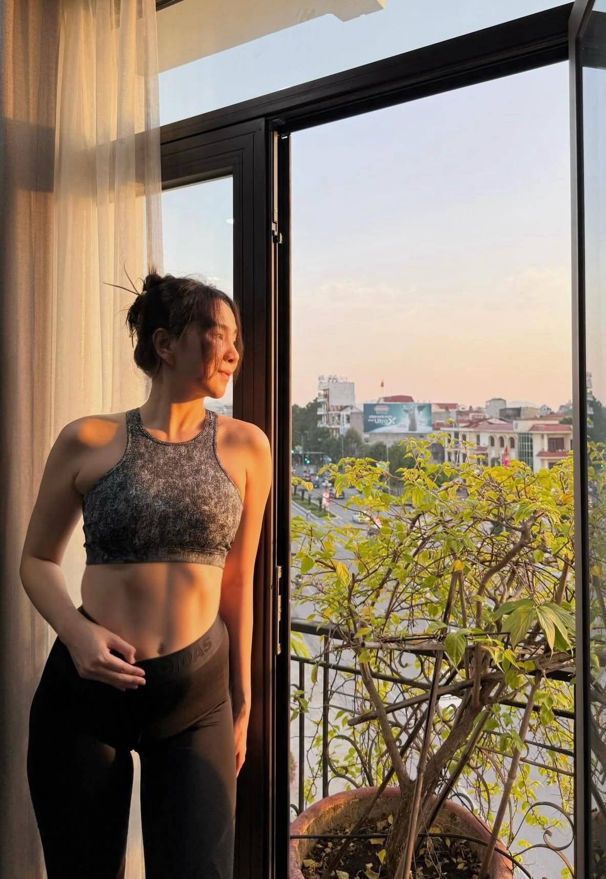 Ban đầu, người đẹp ưu tiên các bài tập nhẹ nhàng như pilates kết hợp đi bộ để phục hồi thể lực. Sau khi cơ thể quen dần với cường độ vận động, cô chuyển sang chạy máy tại nhà và tăng dần các bài tập siết cơ.