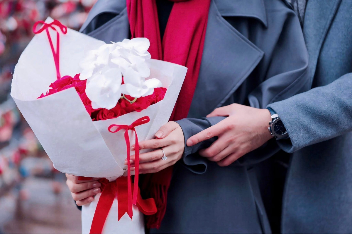 Trong khung cảnh mùa đông lãng mạn, với sắc đỏ và trắng của bó hoa hồng và hoa lan làm điểm nhấn, Phạm Đức Huy đã quỳ gối trao nhẫn cho bạn gái trước hàng ngàn chiếc khóa tình yêu.