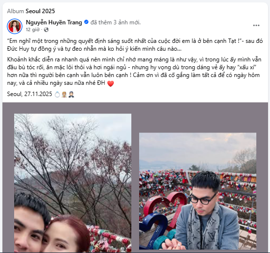 Vào ngày 27/11/2025, MC Mù Tạt và Phạm Đức Huy đã chia sẻ tin vui trên trang cá nhân, đăng tải loạt ảnh ghi lại khoảnh khắc cầu hôn ngọt ngào tại Hàn Quốc. Nam cầu thủ hài hước viết: ""Đang đùa đùa. Ai ngờ gật đầu thật! Xin lỗi tất cả anh em! Từ nay tằng 2 thiếu vắng 1 nhân tố chủ lực!!! Chốt đơn!".