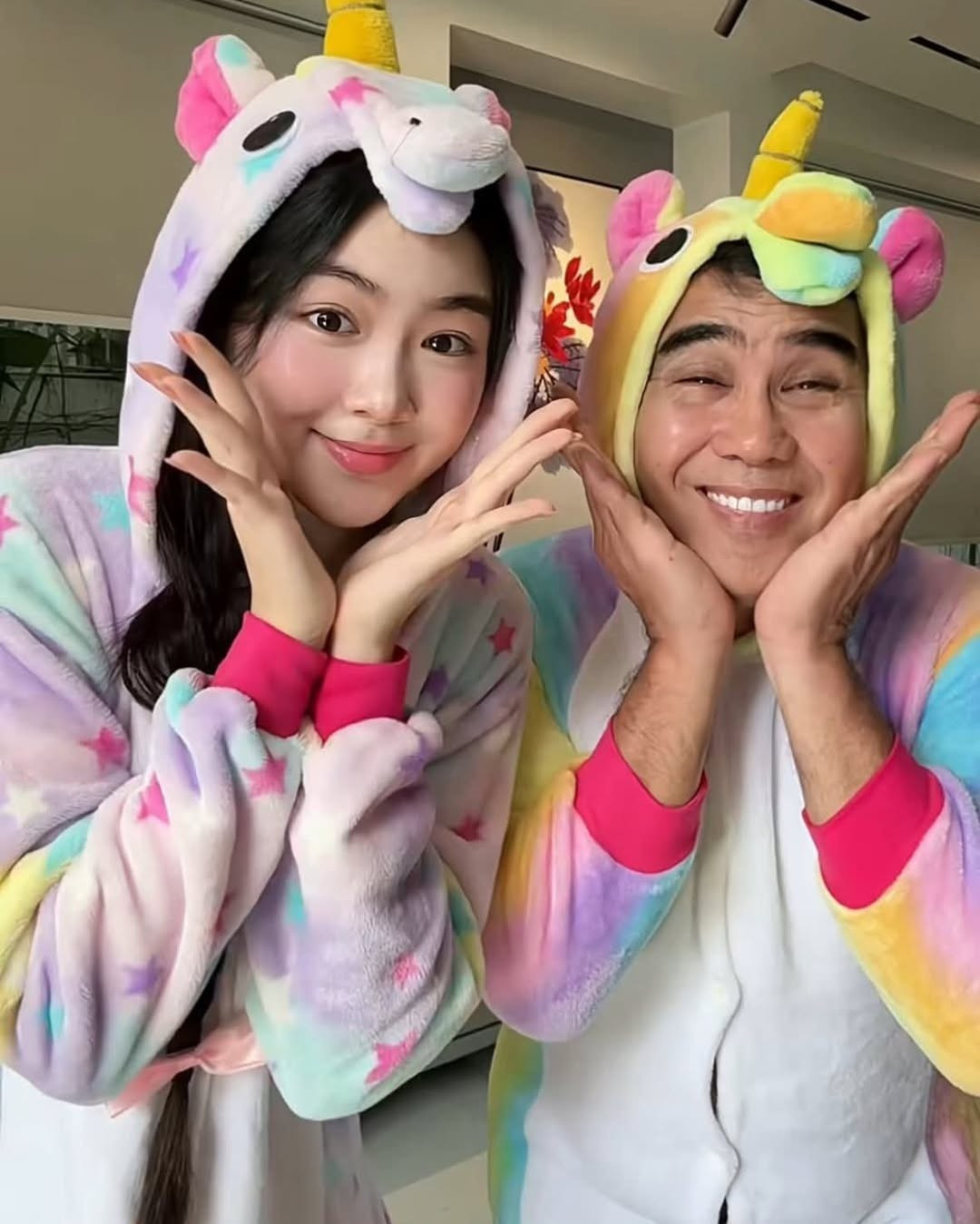 Quyền Linh và con gái đều diện bộ đồ liền thân hình kỳ lân với gam màu pastel rực rỡ. Cả hai cùng tạo dáng thân mật, nở nụ cười tươi rạng rỡ. (Ảnh: @mai.thaolinh)