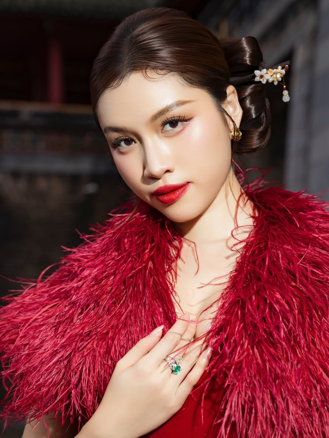Diện thiết kế đỏ nổi bật với phần cổ lông vũ mềm mại kết hợp chân váy họa tiết rồng phượng sắc vàng rực rỡ, Thanh Thanh Huyền toát lên vẻ đẹp vừa hiện đại vừa gợi nhớ tinh thần hoàng gia Á Đông.