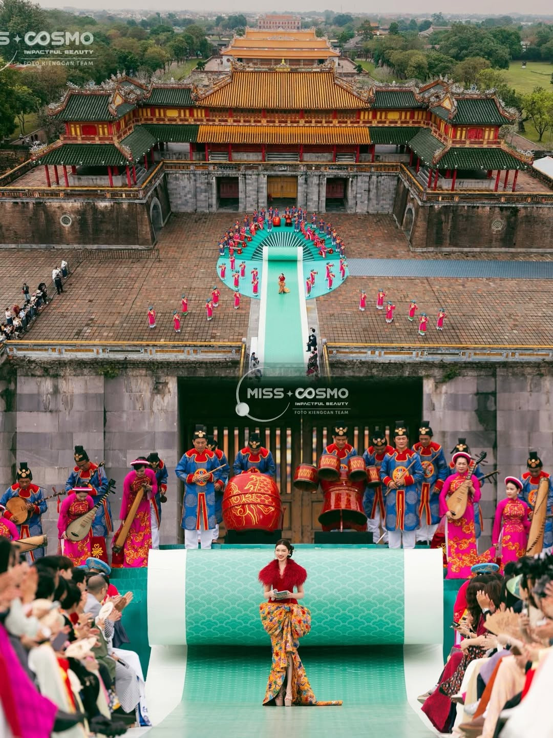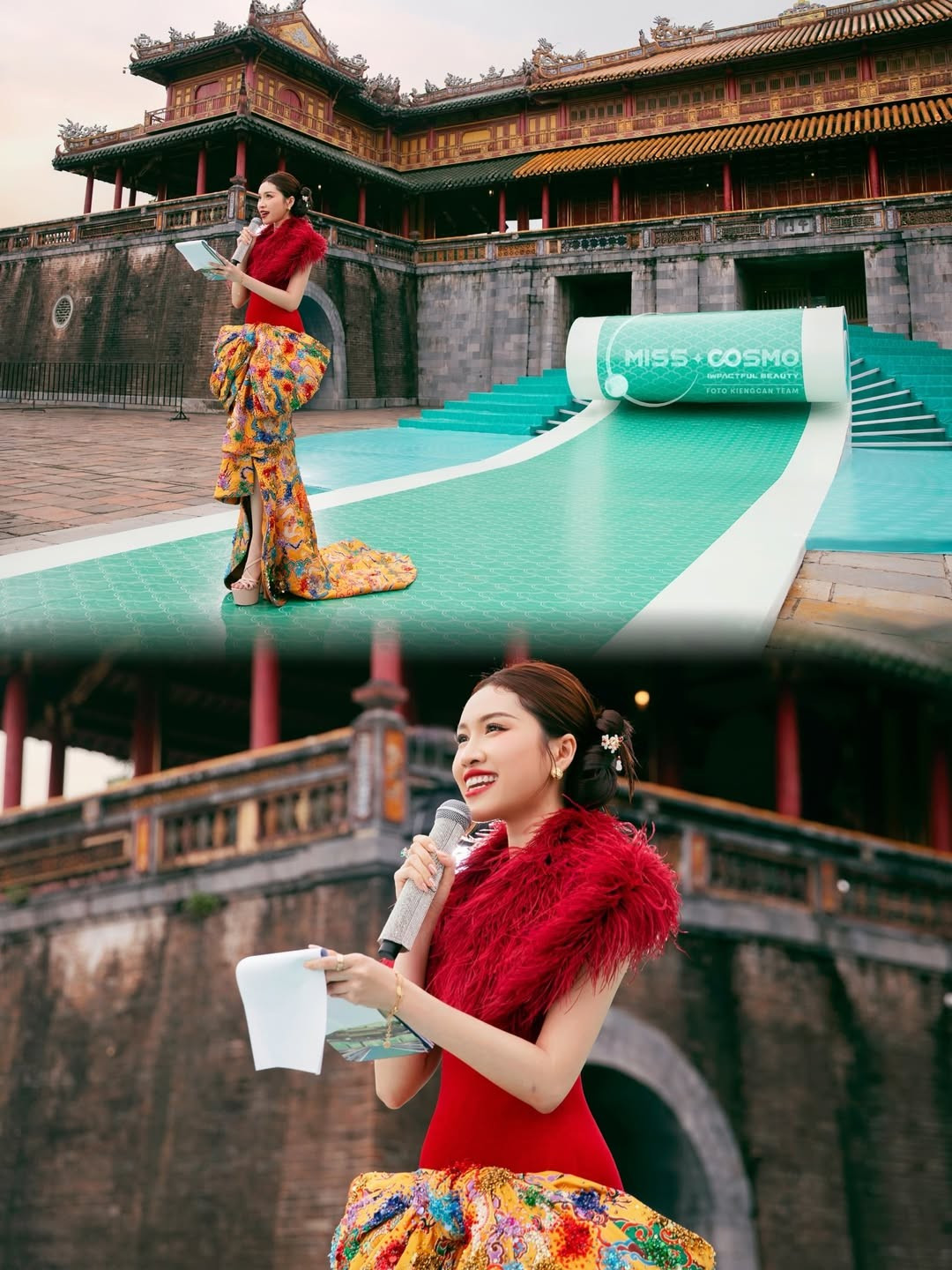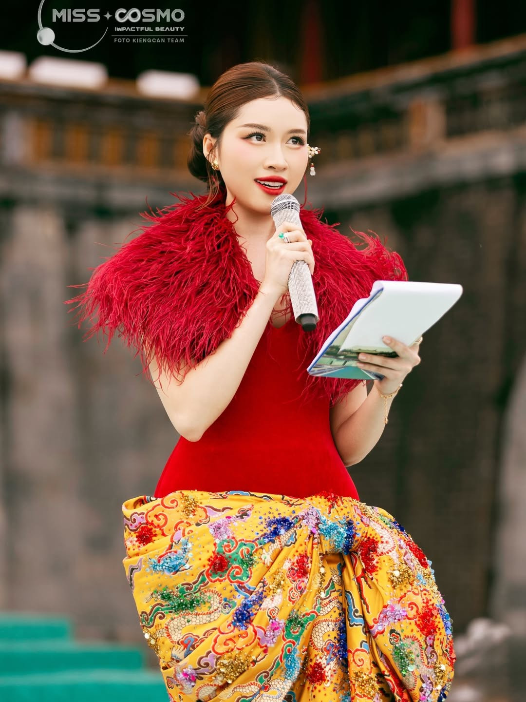 Trong loạt ảnh ghi lại khoảnh khắc 'nữ MC chân dài nhất Việt Nam' cầm mic dẫn chương trình, cô khiến khán giả không khỏi trầm trồ bởi vẻ đẹp sắc sảo, thần thái kiêu sa và phong cách thời trang nổi bật giữa bối cảnh cổ kính của Hoàng thành Huế.
