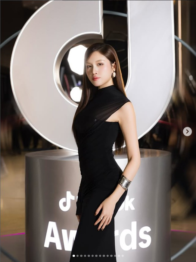 Chiếc váy dáng ôm làm tôn lên thân hình mảnh mai và đôi chân dài nổi tiếng của Thanh Thanh Huyền. Mái tóc búi cao gọn gàng, điểm xuyết phụ kiện cài tóc tinh tế càng giúp gương mặt cô thêm phần thanh thoát.