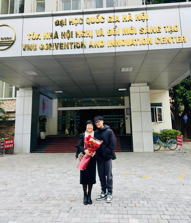 2 mẹ con nữ MC chụp ảnh kỷ niệm trước trường đại học.