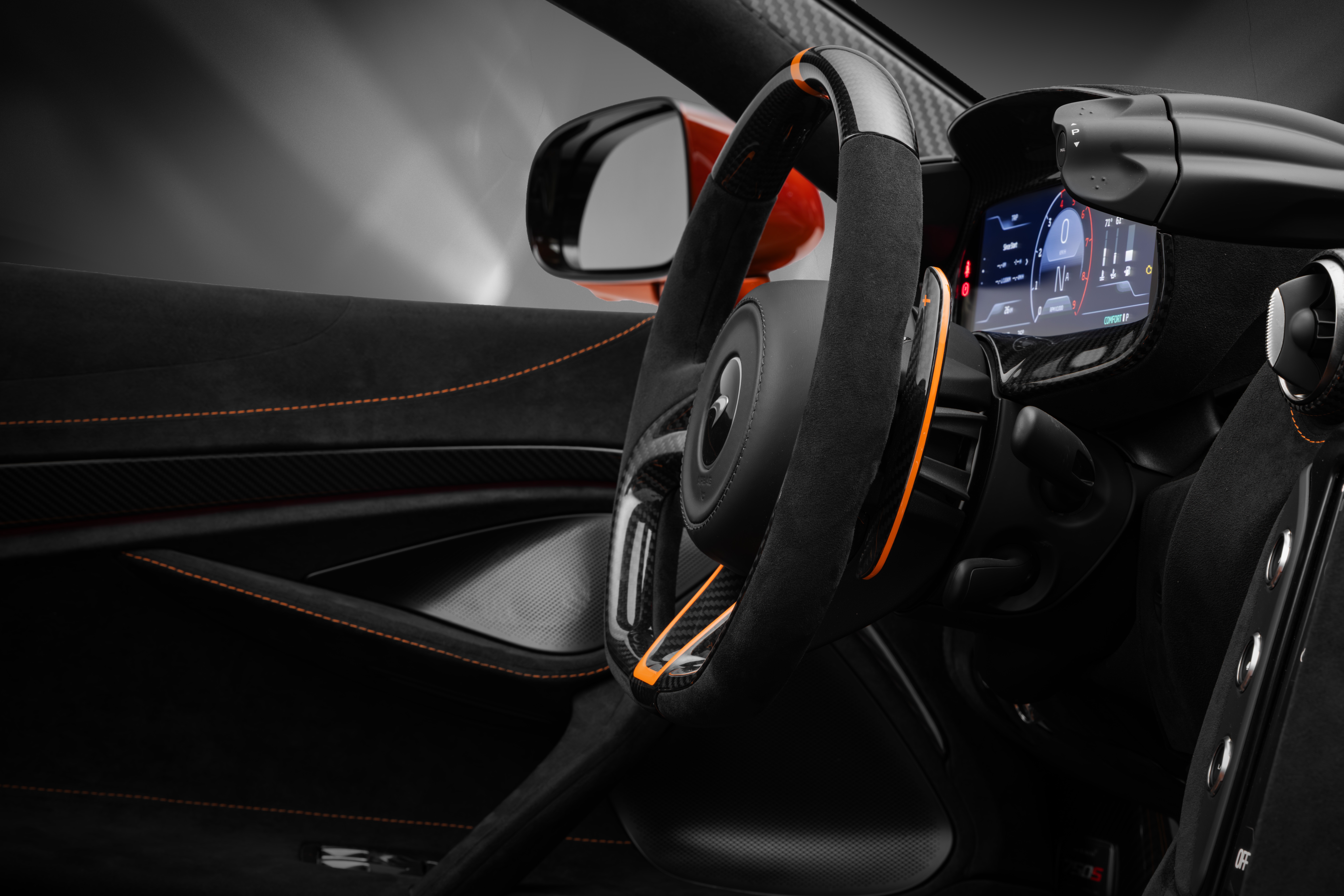 Bên trong khoang lái, 750S MSO Orange cũng được đính các chi tiết nhấn màu cam ở chỉ khâu, vô lăng, bàn đạp, thảm sàn và tựa đầu dập nổi mới.