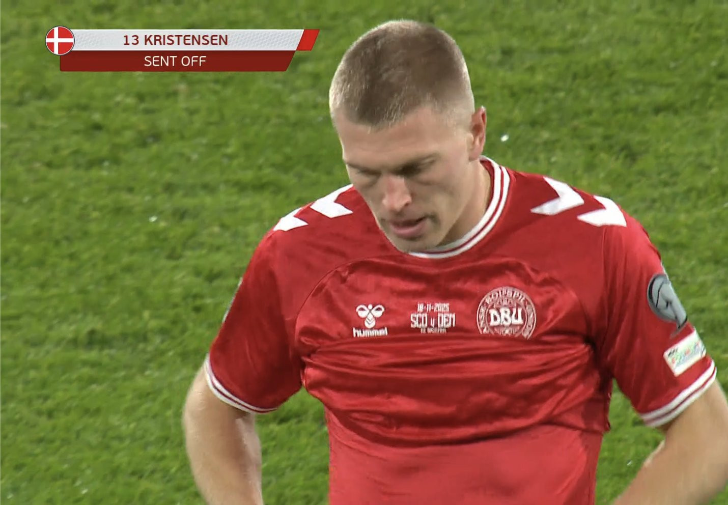 Bước ngoặt trận đấu xảy ra ở phút 62, Kristensen nhận thẻ đỏ rời sân. Đan Mạch chỉ còn chơi với 10 người