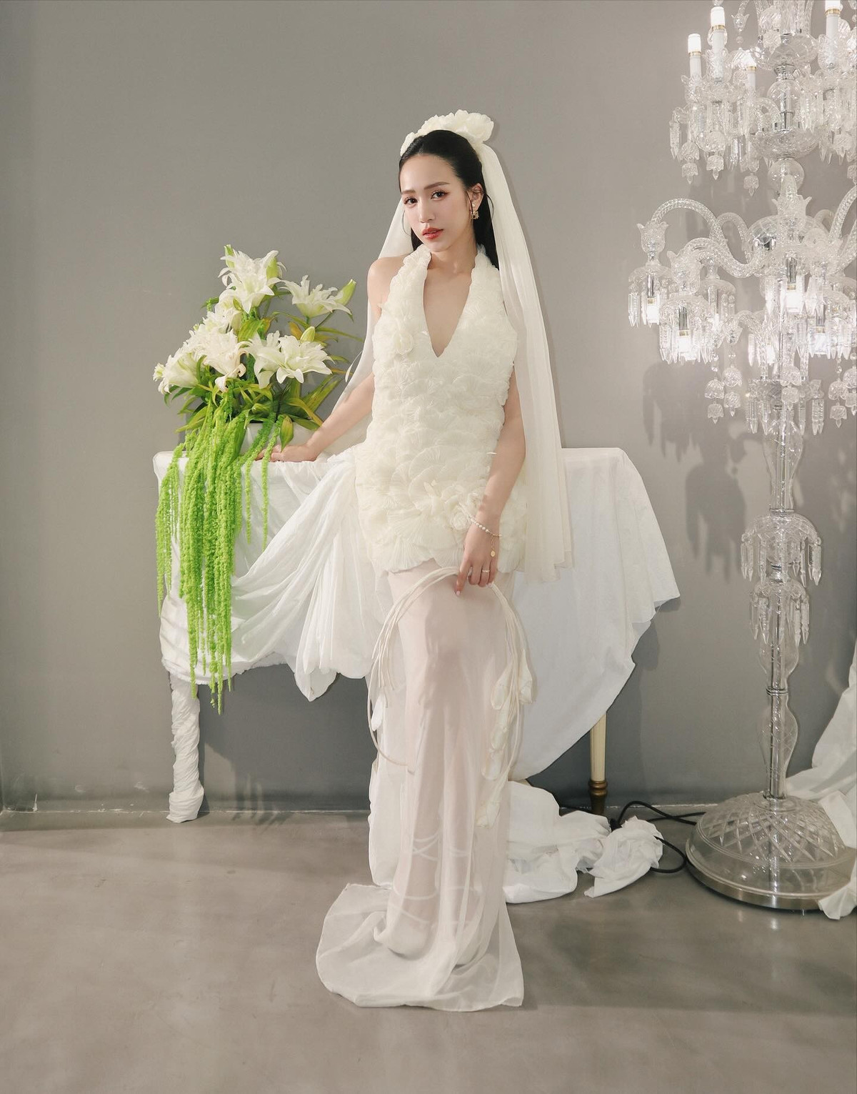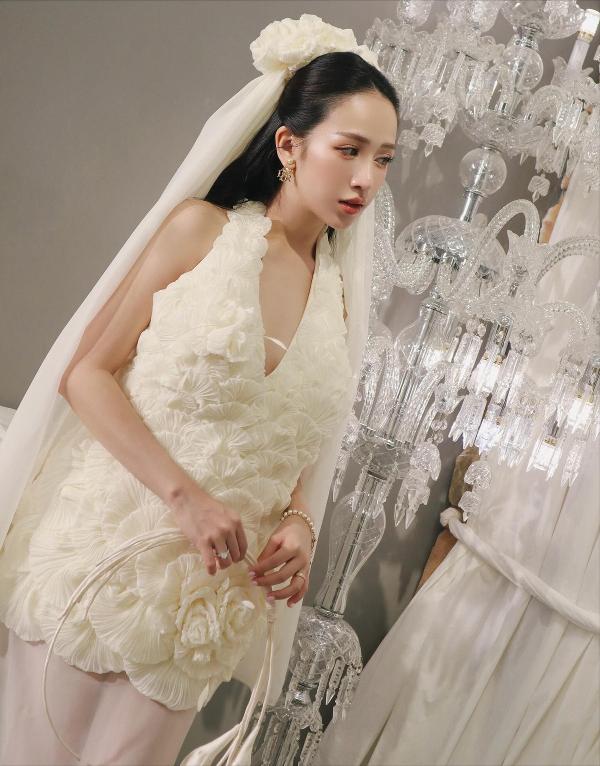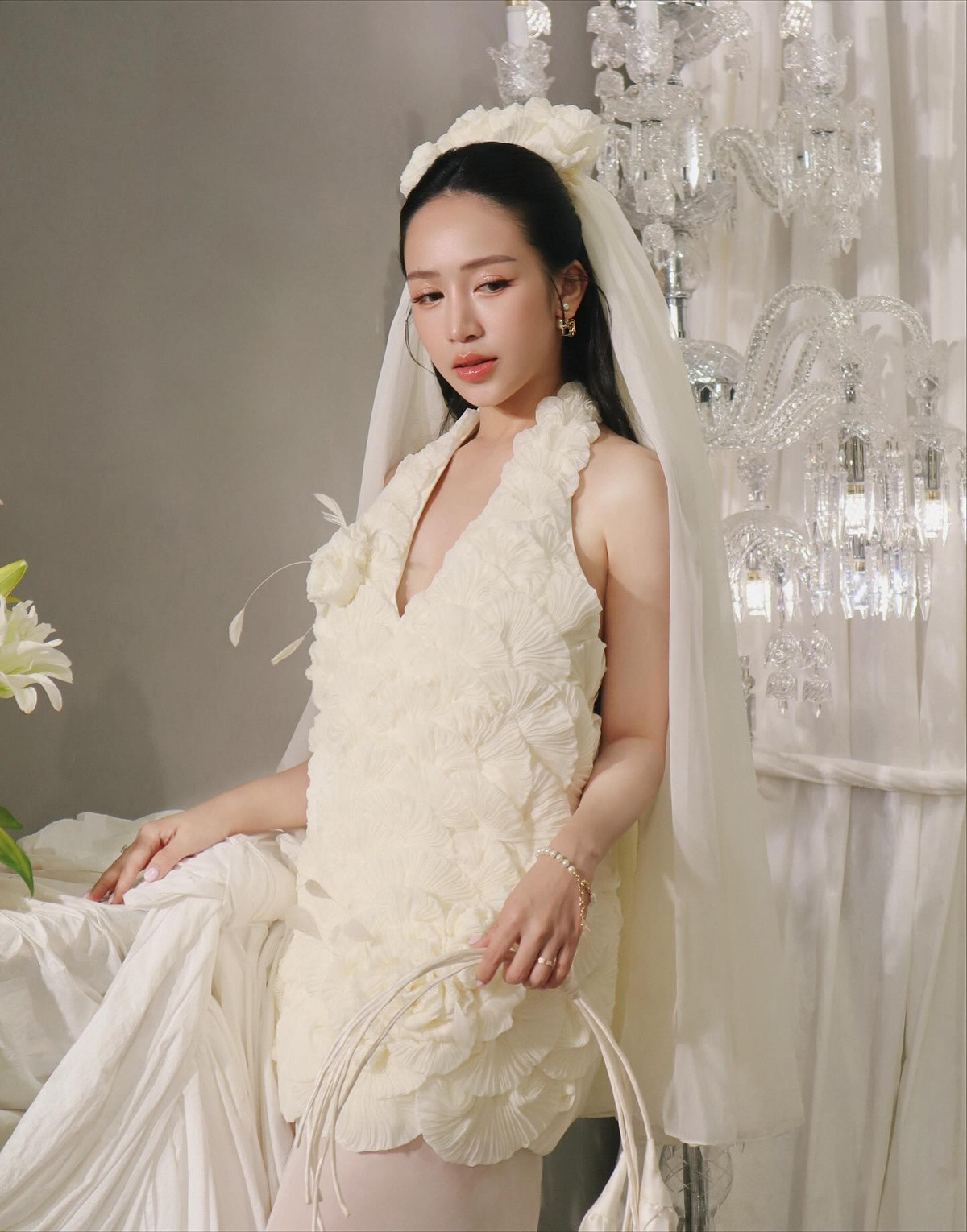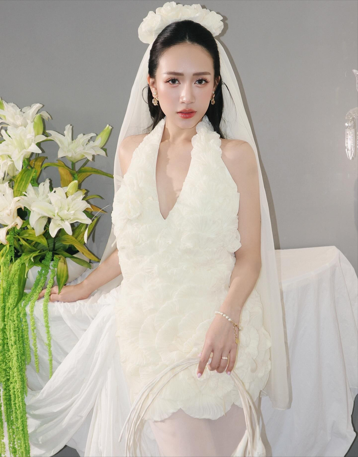 Cô diện một chiếc váy cưới dáng ngắn, màu trắng kem, được đính kết thủ công bằng vô số cánh hoa 3D tỉ mỉ. Chi tiết cổ yếm khoét sâu làm nổi bật bờ vai thon thả, trong khi phần voan dài bên dưới tạo cảm giác bay bổng, thướt tha. (Ảnh: FBNV)