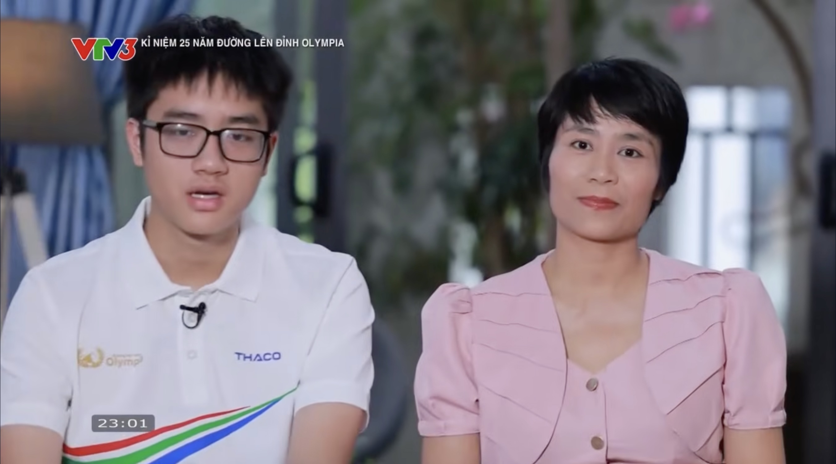 Xuất hiện tại Gala kỷ niệm 25 năm Đường lên đỉnh Olympia, cặp mẹ con Nguyễn Thúy Hà và Đỗ Anh Minh (Hà Nội) khiến nhiều người thích thú khi mẹ là cựu thí sinh năm đầu tiên, con trai vừa dự thi năm 25. Khoảnh khắc nhìn Anh Minh đứng đúng vị trí mà mình từng đứng 25 năm trước, bà Hà không khỏi xúc động. Chàng trai đại diện trường TH, THCS và THPT Vinschool cuối cùng dừng chân ở vị trí thứ hai cuộc thi tuần. Trước kết quả này, bà Hà mong con trai học được cách chấp nhận thất bại, biết đứng dậy và tiếp tục cố gắng. Ảnh: VTV.