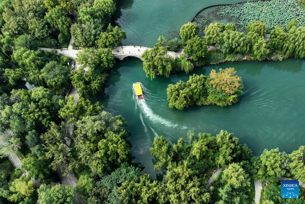 Du khách đang đi thuyền tham quan một thắng cảnh ở thành phố Tế Nam, tỉnh Sơn Đông, miền đông Trung Quốc, ngày 13/10.