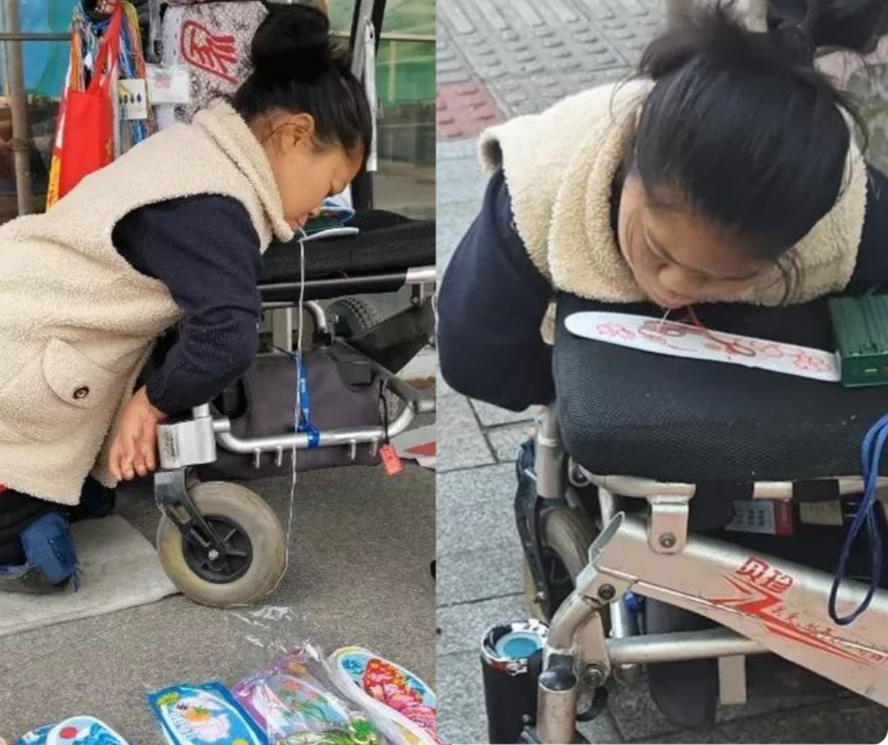 Theo thông tin, người phụ nữ tên Đới (Trùng Khánh, Trung Quốc), khuyết tật bẩm sinh, đôi tay và đôi chân không thể vận động bình thường. Vì vậy chị chỉ có thể dựa vào miệng để làm việc kiếm sống.