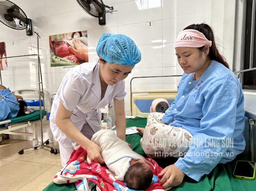 Cán bộ Trung tâm Y tế khu vực Bắc Sơn chăm sóc mẹ và bé sau sinh, tuyên truyền hướng dẫn thực hiện sàng lọc sơ sinh