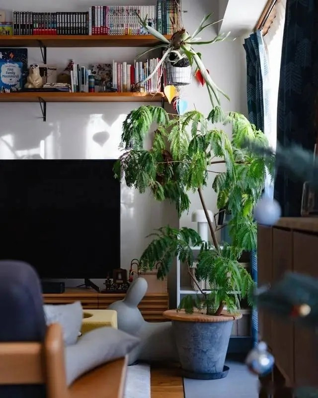 Sàn gỗ nguyên khối kết hợp thảm xám nhạt và chậu cây xanh khéo đặt ở góc, vừa thêm sắc màu, vừa ổn định không gian. Ảnh: 6parkbbs