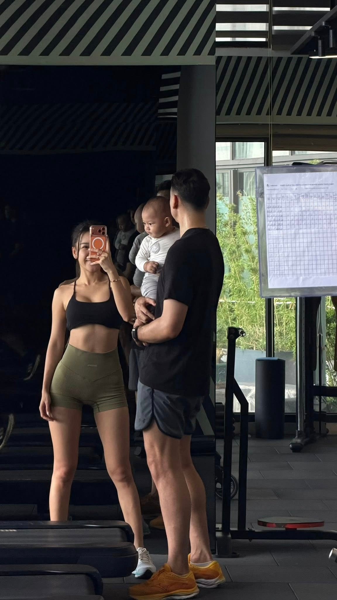 Người đẹp bế con trai nhỏ cùng tập luyện trở thành hình ảnh vô cùng quen thuộc, bình yên nhưng cực cuốn hút.