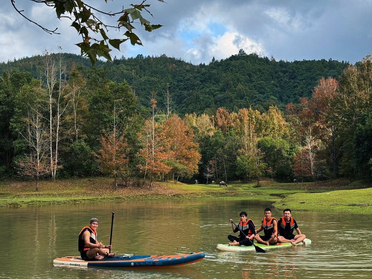 Du khách đến Rừng Phong Hương có thể kết hợp nhiều hoạt động thú vị. Ngoài việc ngắm cảnh và chụp ảnh, việc khám phá lòng hồ Rào Quán bằng thuyền hoặc SUP giúp du khách có góc nhìn toàn cảnh về khu rừng. Ảnh Trúc Dương