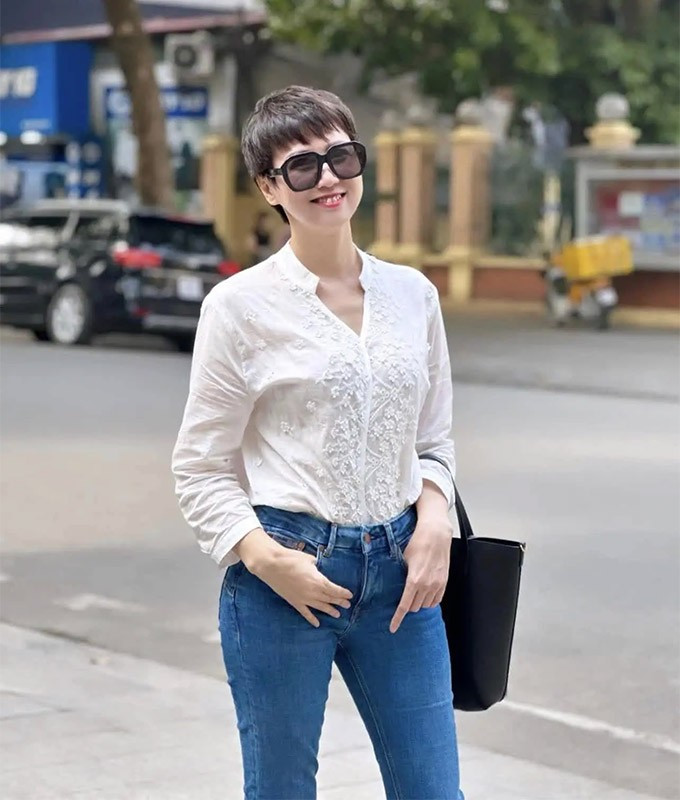 Kiểu tóc pixie ngắn cá tính cùng lối makeup nhẹ nhàng càng giúp bà ghi điểm với hình ảnh quý cô thành thị hiện đại, phóng khoáng.