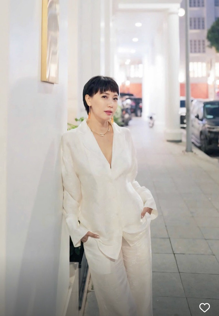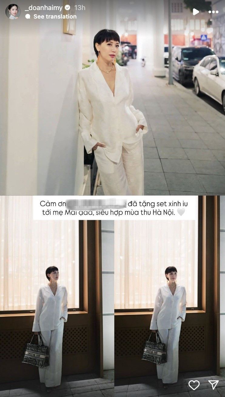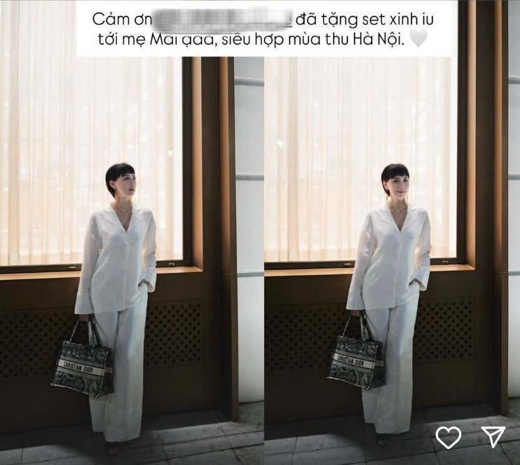 Trên story Instagram của con gái, cô Mai Đoàn xuất hiện với set suit trắng được thiết kế tinh giản nhưng đầy tinh tế. Chất liệu lụa nhẹ, phom dáng thoải mái giúp tôn lên vẻ thanh lịch và hiện đại.