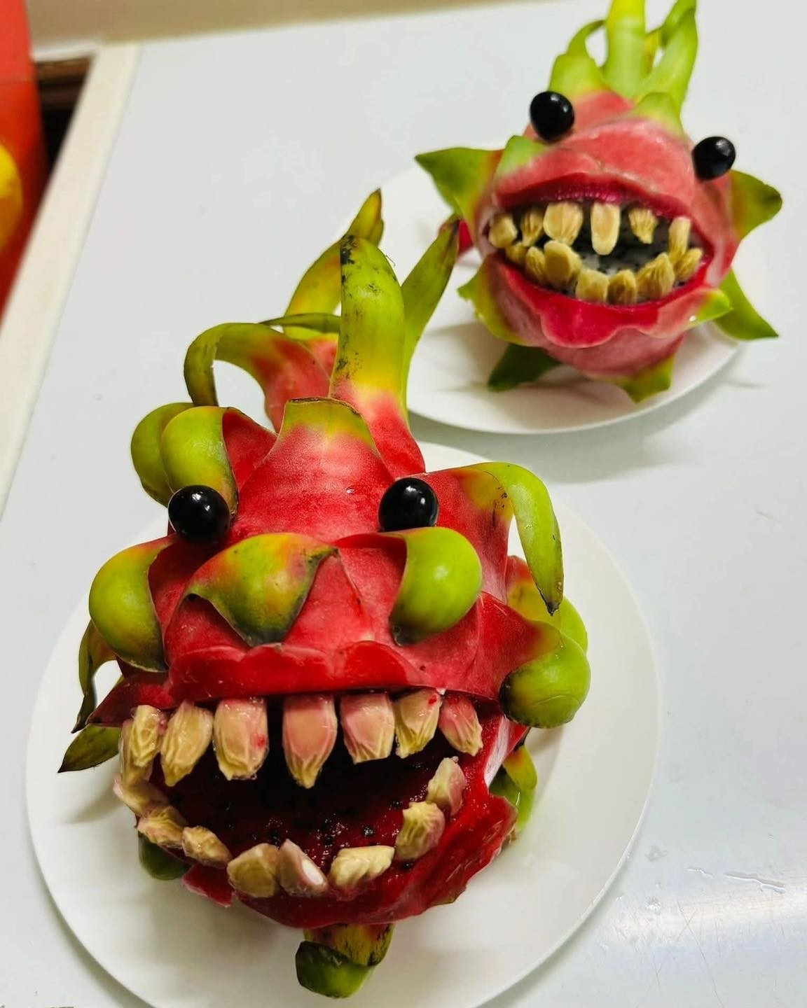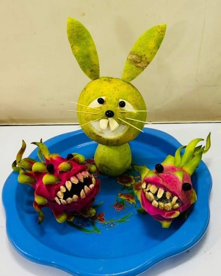 Tuy nhiên, không phải lúc nào sự sáng tạo cũng đi theo hướng... dễ thương. Mới đây, một loạt hình ảnh về những tác phẩm tỉa trái cây đón Trung Thu đã gây bão mạng xã hội, khiến cư dân mạng không khỏi phì cười và đưa ra những bình luận hài hước vì độ... rùng rợn. (Ảnh: FB Phạm Chuyên)