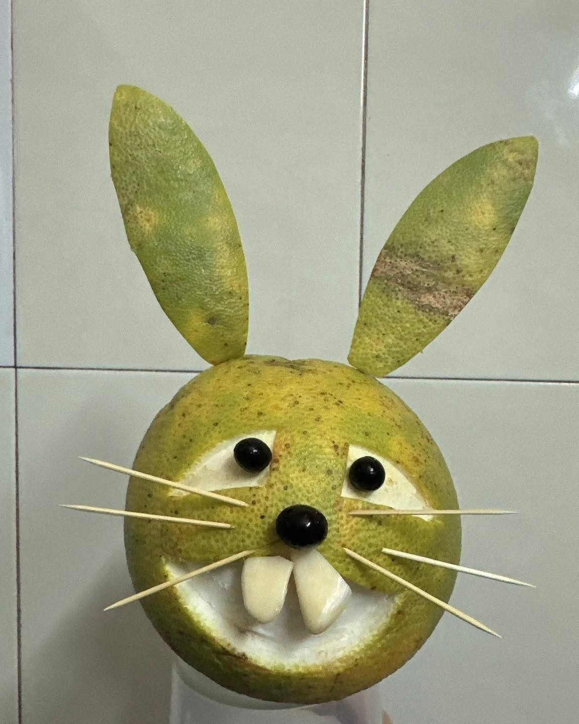 Hình ảnh chú thỏ ngọc - biểu tượng của Trung Thu - đã được làm từ quả bưởi và xanh, nhưng lại có một đôi răng nanh trắng muốt nhọn hoắt lộ ra. (Ảnh: FB Phạm Chuyên)