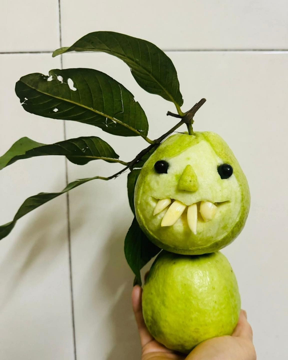 Quả ổi xanh có hình dáng đầu người được tạo hình với chiếc mũi nhọn và hàm răng nanh to, sắc lẹm, mang đậm phong cách của những nhân vật phản diện trong phim kinh dị. (Ảnh: FB Phạm Chuyên)