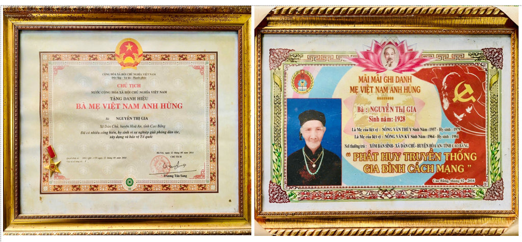 Năm 2014, Đảng, Nhà nước đã phong tặng danh hiệu "Bà mẹ Việt Nam Anh hùng" cho mẹ Nguyễn Thị Gia.