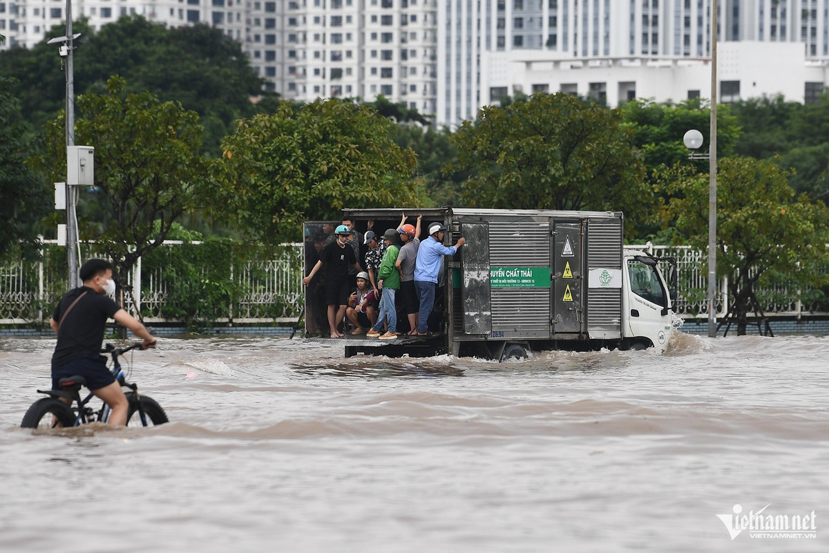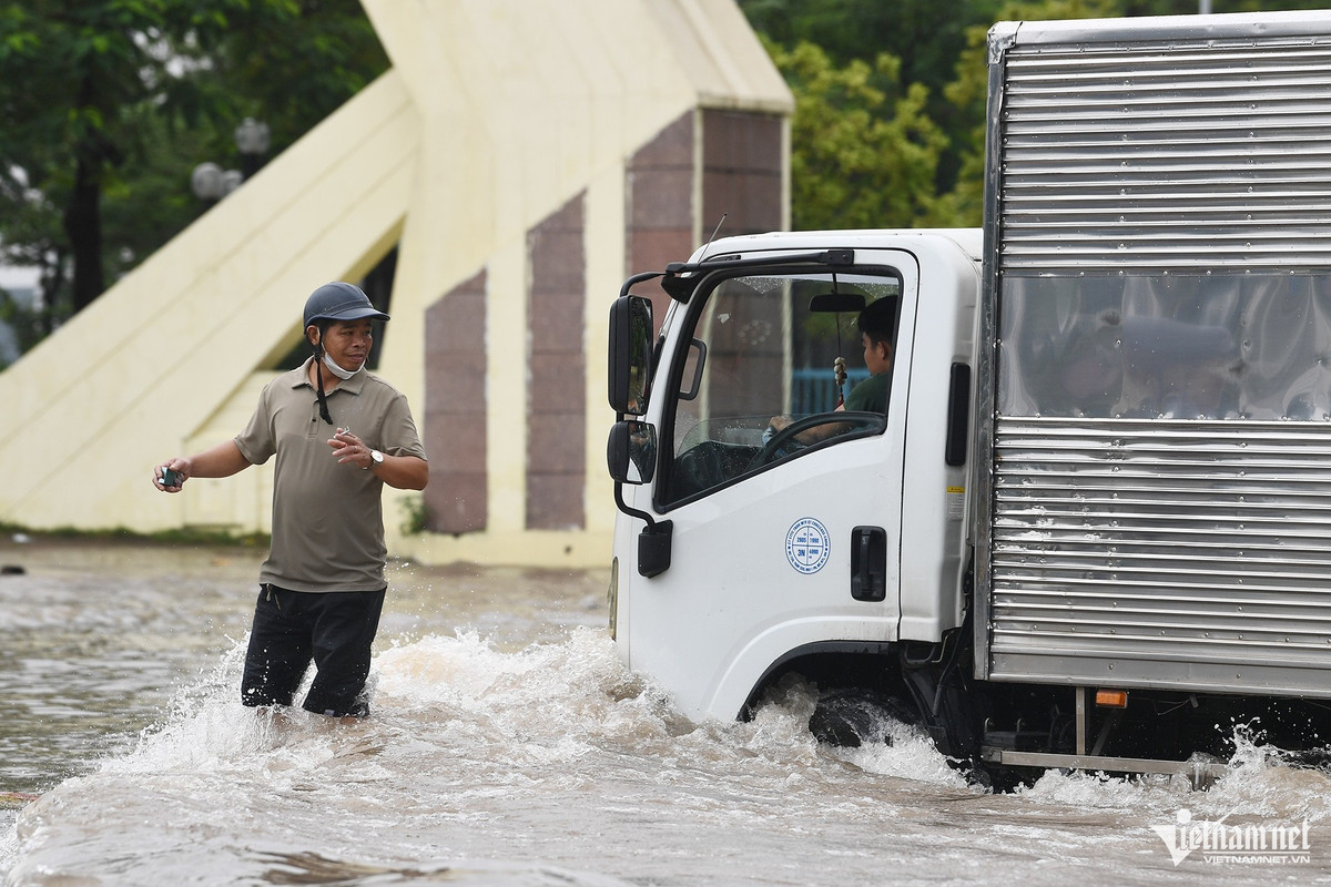 Nhiều xe tải qua được đoạn ngập an toàn nhưng cũng có xe chết máy giữa dòng nước ngay tại Quảng trường Mỹ Đình.