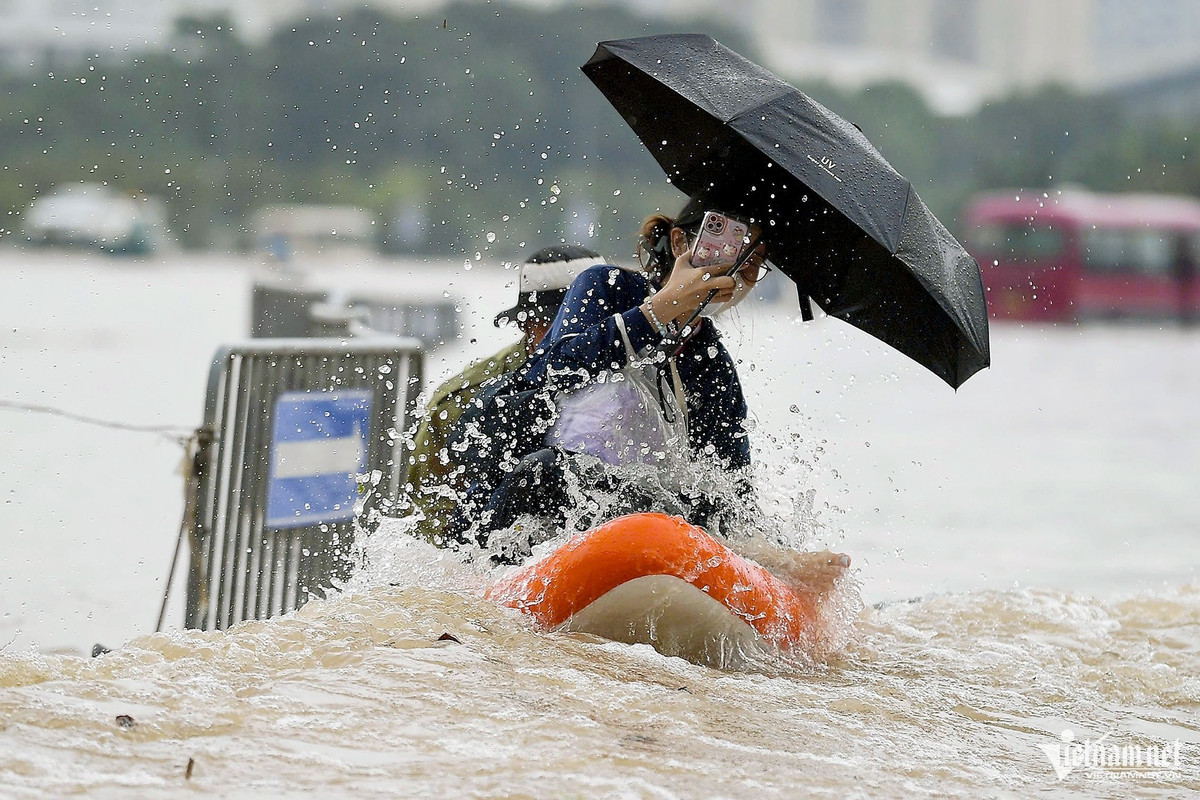 Một người đàn ông chèo thuyền hơi hỗ trợ người dân qua đoạn ngập sâu trên đường Lê Quang Đạo, đoạn trước cửa sân vận động Mỹ Đình.