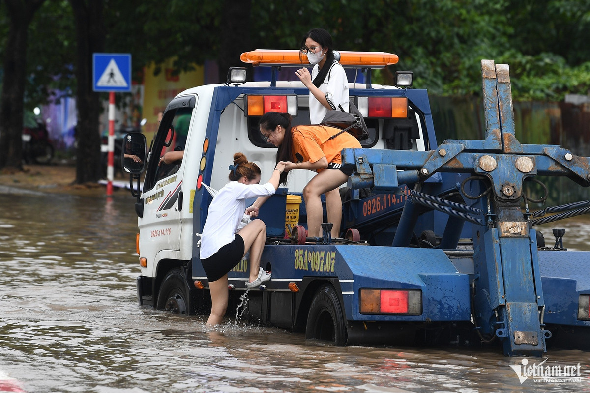 Ba cô gái được một tài xế xe cứu hộ cho đi nhờ qua đoạn ngập trên đường Lê Quang Đạo.