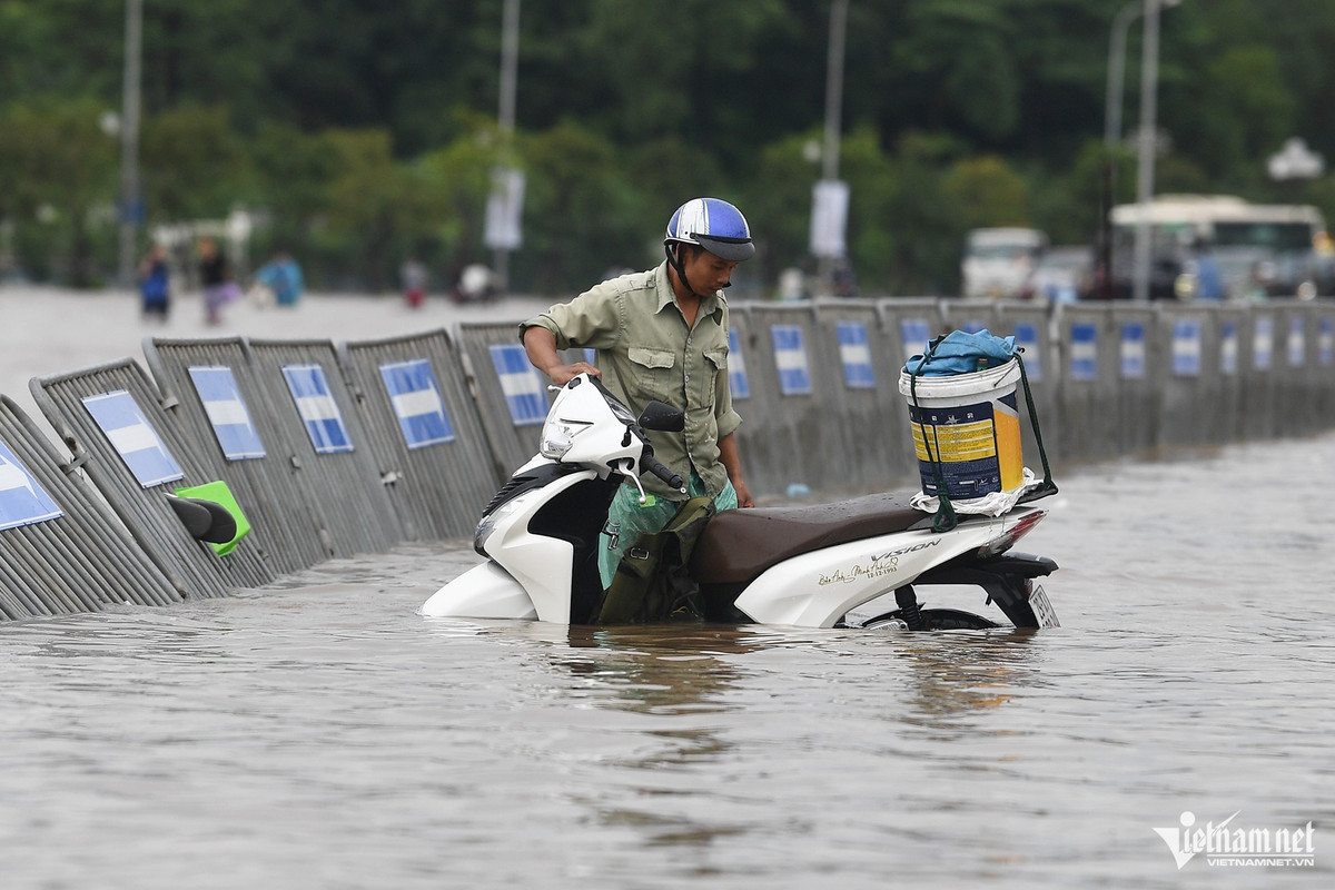 Một công nhân cố gắng vượt qua “cảng nước sâu” Mỹ Đình - nơi ngập sâu đến lút bánh xe - nhưng xe bị chết máy giữa chừng.