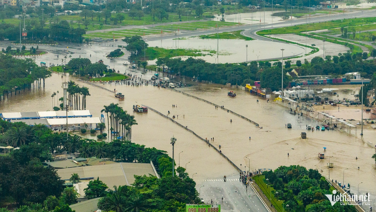 Một đoạn đường dài Lê Quang Đạo nơi ngang qua sân vận động Mỹ Đình mênh mông nước ngập từ khi mưa trút xuống lúc 5h sáng 7/10 và kéo dài đến tận 16h.