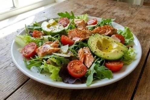 Món salad cá hồi bơ chứa chất xơ, chất béo lành mạnh và protein cần thiết giúp giảm tác hại của rượu bia. Ảnh minh họa: AI