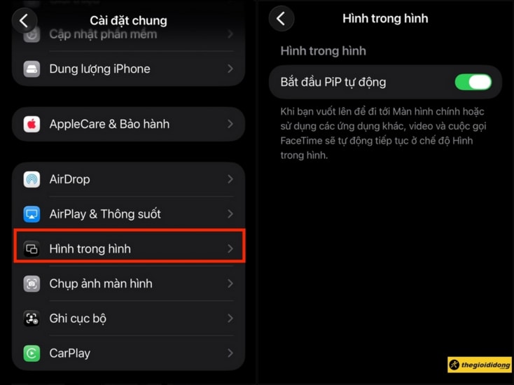 Bước 2: Chọn mục Hình trong hình và gạt nút bật tại dòng Bắt đầu PiP tự động.