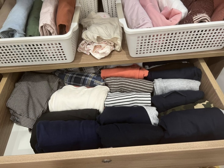 Với những loại quần áo không cần treo như đồ mặc nhà, áo thun, đồ lót, hãy gấp gọn và xếp vào các giỏ nhựa. Mỗi giỏ nên chứa một loại đồ nhất định. Điều này không chỉ giúp bạn dễ dàng tìm thấy món đồ mình cần mà không làm xáo trộn các món khác, mà còn giúp các thành viên khác trong gia đình (như chồng hoặc con cái) tự lấy đồ một cách gọn gàng.