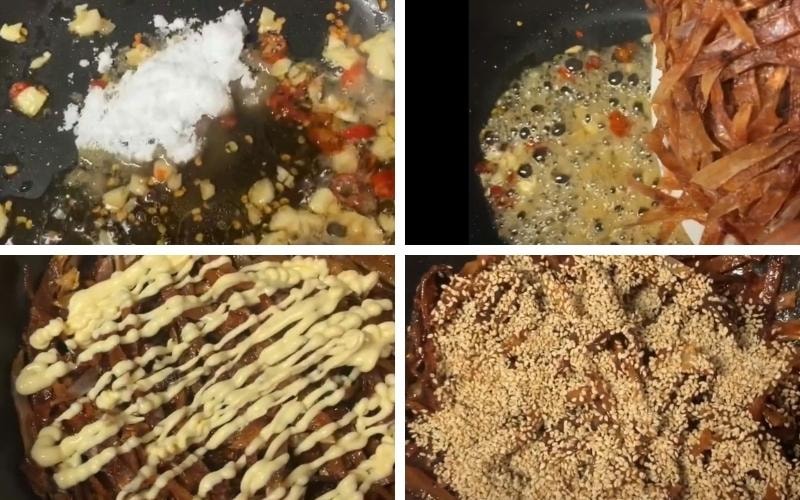 Để tạo độ ngậy, bạn thêm vào 2 – 3 muỗng canh sốt mayonnaise tùy theo khẩu vị và tiếp tục đảo đều. Cuối cùng, rắc 1 – 2 muỗng canh mè rang vào, đảo nhanh tay thêm một lần nữa rồi tắt bếp.