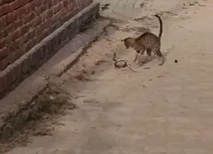 Theo thông tin trong clip, sự việc xảy ra tại khu vực đồn cảnh sát Lalganj, huyện Pratapgarh, bang Uttar Pradesh, Ấn Độ. Một con rắn chuột được cho là đã bò ra từ cống và tiến về phía một ngôi nhà gần đó. Tại đây, con rắn bất ngờ chạm trán với con mèo nhà đang ở trong khu vực.