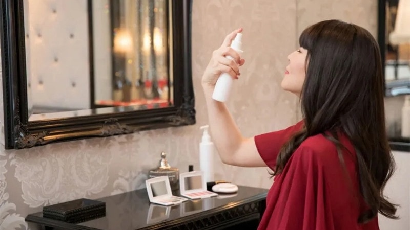 Sử dụng xịt khóa nền có chức năng cấp ẩm để loại bỏ cảm giác khô phấn và tạo hiệu ứng da căng bóng tự nhiên.