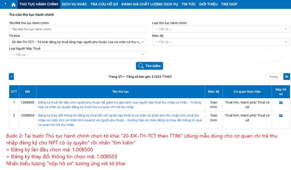 Bước 2: Tại phần Thủ tục hành chính, bạn chọn tờ khai "20-ĐK-TH-TCT theo TT86". Đây là mẫu dành cho cơ quan chi trả thu nhập đăng ký cho người phụ thuộc có ủy quyền. Sau đó nhấn "Tìm kiếm".